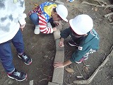 どんぐりや松ぼっくりを使って、遊ぶものを作る学習をしていました。完成したコマ、けん玉で楽しく遊んでいました。