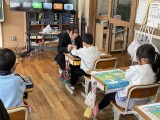 教育実習生による精錬実習を実施しました。かげ絵の形に三角形の色板をしきつめて、何枚をどのように組み合わせているかを考えていました。実際に手を動かしながら数えることで、子供たちも楽しそうに学習していました。