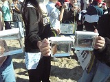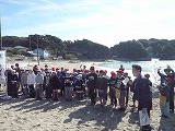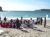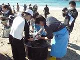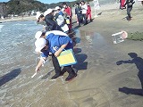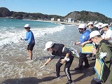 守谷海岸で、マダイの稚魚の放流体験をしました。豊浜小と総野小の5年生と交流しながら、マダイの稚魚を観察し、海へと放流しました。学校に戻り、3校みんなでブダイのメンチカツを食べながら親交を深めました。