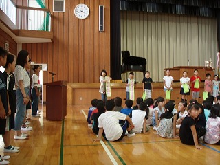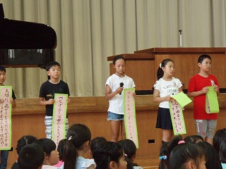 各クラスで話し合った標語を全校の前で発表しました。