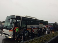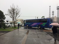 キュステに集合した時点では風雨が強く、バスに乗る際もぬれてしまいましたが、全員参加のもと無事予定通りに出発しました。予報では、やや気温が低いものの、天候は回復していくようです。