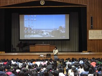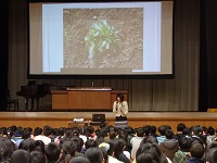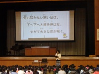 校長先生から,「何も咲かない寒い日は,下へ下へと根を伸ばせ。やがて大きな花が咲く。」という, マラソンの高橋尚子選手が座右の銘にしている言葉について教えていただきました。この言葉には,「いくら努力をしてもなかなかいい結果が出ないこともあります。しかし,やがてきっと大きな花が咲くという希望をもち続け,くじけす,こつこつと努力していくことが大切です。努力し続けていくことは大きな成長につながります。」という意味があるそうです。