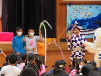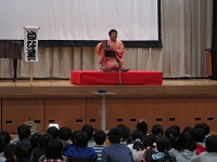 第2部では,全校児童が参加し,落語を聞いたり,ふるさと勝浦の音のクイズに参加したり,大江戸玉すだれを見たり体験したりしました。