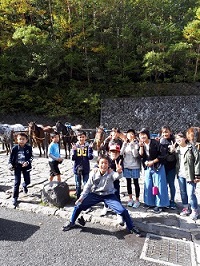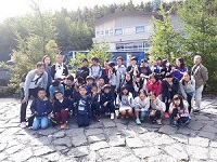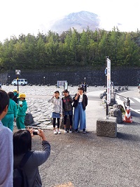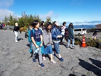 富士山五合目に到着し、集合写真を撮影後、周辺を散策しています。