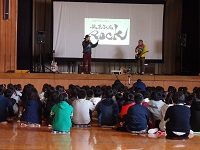 「みんな仲間 助け合い」をテーマにした,駄菓子屋Rock2名の歌と講話が勝浦小学校の体育館で開催されました。