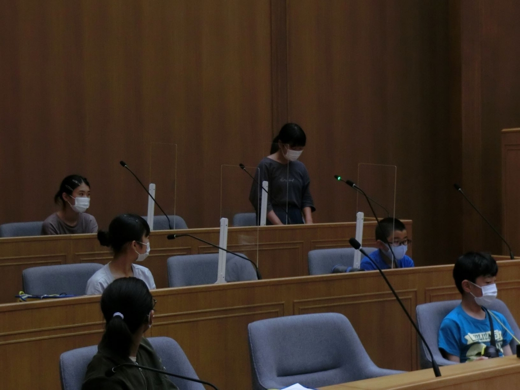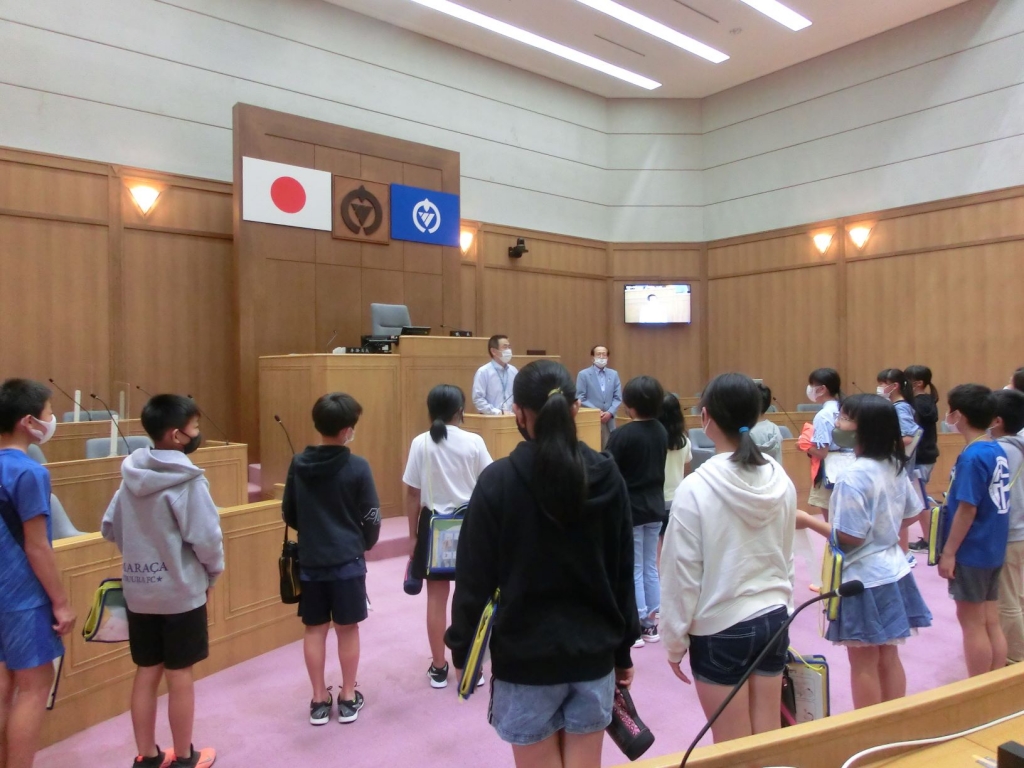 議場に入らせていただき、子どもたちは初めて見る場に驚いていました。