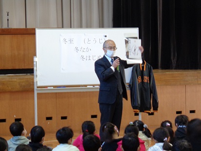 12月23日(木)2学期の終業となりました。集会では、校長先生より「冬至(とうじ) 冬なか 冬はじめ」ここから寒さが厳しくなるので体調管理に気をつけるように等の話がありました。また、本校の卒業生である読売巨人軍の丸佳浩選手から送られた色紙の紹介等がありました。いよいよ14日間の冬休みです。一日一日有意義な日々を過ごしましょう。