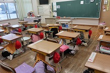 大きな地震が発生したという想定で、避難訓練を行いました。地震発生の放送が流れると、担任の指示で素早く机の下に避難しました。今日は、新型コロナウイルス感染拡大防止対策のため、ここまでの訓練でした。次回の訓練では、3階廊下に全校で集合し、その後、津波避難訓練で屋上へ避難する練習をしたいと考えています。