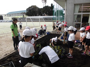 1年生が,ビオラの苗を植えました。まず,自分の鉢に苗を植えました。その後,1年生用の花壇に,自分たちで話し合って決めた絵になるように,ビオラの苗を植えました。きれいな花が咲いてくれるように,みんなで育てていきます。