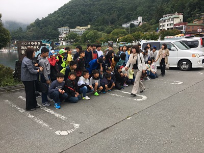 出発前に、河口湖畔で集合写真を撮りました。