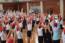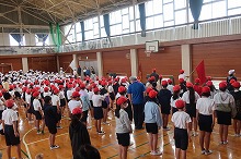 今日から、全校そろっての運動会全体練習が始まりました。雨でグラウンドが使えないため、体育館で練習を行いました。今日の全体練習は、開会式、閉会式、なのはな体操でした。
