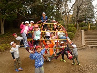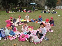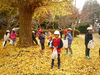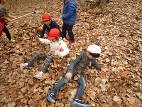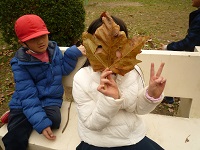 大きな落ち葉でお面を作ったり,かさかさの落ち葉を集めて山を作ったりしました。普段なかなかできない遊びに大はしゃぎでした。子どもたちは,五感を使って秋を感じることができました。