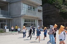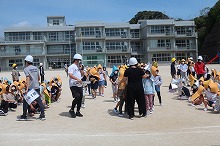 避難指示の放送が流れると、全校児童は防災頭巾をかぶり、口を覆い、静かにグラウンドに避難しました。どのクラスの児童も、大変すばらしい避難行動がとれていました。