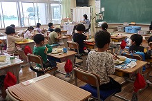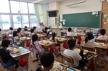 どの児童も楽しみにしている給食の時間。みんな前を向いて、静かに食事をしています。(マスクを外しているときは、おしゃべりをしないようにしています)