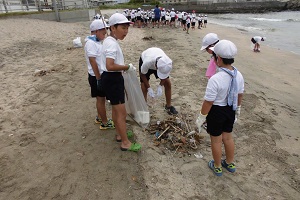 全校児童で,勝浦中央海水浴場の海岸清掃を行いました。