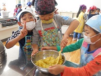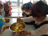 3時間目,4時間目に畑で育てたサツマイモで茶きんしぼりを作りました。