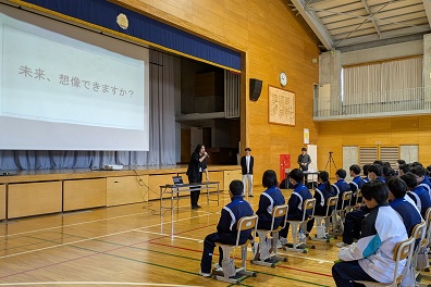 3月12日(木)に株式会社アラヤより3名の講師の方々をお招きし、1年生を対象とした「ムーンショット型研究授業」を行いました。ムーンショット型研究とは、日本が直面している少子高齢化などの困難な社会課題に対し、AI(人工知能)などの先端技術を活用しながら解決策を創造することを目的とした研究開発の取組です。授業では、人工知能が今以上に身近に活用されている未来の社会の様子について紹介していただいたほか、未来の社会で起こりうる変化や課題についてお話をいただきました。グループワークでは、2050年を舞台にしたSF小説や漫画を読んで、「2050年にはどのような新しい技術が生まれているか」「どのような社会問題が起こるのか」をテーマに話し合いを行いました。生徒からは「病院ではAIが手術をするから失敗がなくなる」「学校がVR空間になり、登校する必要がなくなる」といった未来の姿に関する意見が出された一方、「AIがすべてを行うことで人と人のコミュニケーションが減ってしまう」「人間の考える力が弱くなるのではないか」といった社会課題についての意見も挙げられました。AIによって生活が便利になる可能性を学ぶとともに、人間らしさや個性など、人が持つ力の大切さについても考える時間となりました。