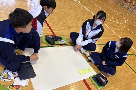 講義では、生態系に悪影響を与えているマイクロプラスチックをはじめとする海洋ゴミの現状について分かりやすく説明していただきました。生徒たちは、普段利用している海にも多くの課題があることを知り、熱心に耳を傾けていました。その後、班ごとに「きれいな海を守り続けるために、自分たちにできることは何か」をテーマに話し合いを行い、考えを紙にまとめて発表しました。「ゴミを出さない工夫」「海岸清掃への参加」「環境に優しい製品を選ぶ」など、身近な行動につなげようとする前向きな意見が多く見られました。