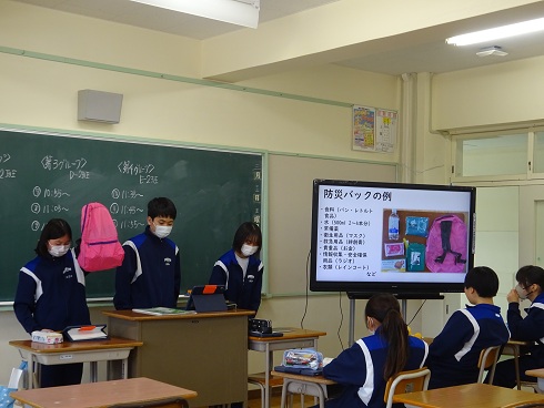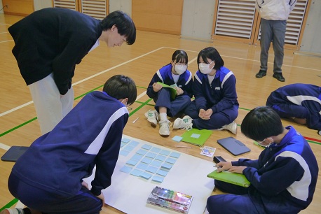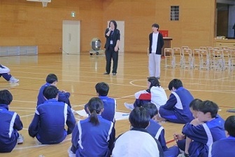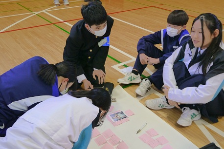 1月21日(水)に市役所高齢者支援課の方やケアマネージャーの方々をお招きし、1年生を対象とした認知症サポーター養成講座を実施しました。講義では、認知症とはどのようなものか、主な症状や種類について分かりやすく説明していただき、正しい知識を学ぶ貴重な機会となりました。講義の途中では、脳の働きを活性化させる活動として、足踏みをしながら三の倍数で手をたたくゲームや認知症予防につながるグーパー運動を紹介していただき、楽しく学ぶ様子が見られました。 講義後半では、実際の場面を想定して、自宅の方向が分からず困っている方や会計をせずに商品を食べてしまった方に対してどのような声掛けや手助けができるかをグループで話し合い発表しました。「相手が嫌な思いをしないように談笑しながら案内する」「明るく優しく話しかけ、お店の人と協力して対応する」などの意見や寸劇で分かりやすく伝えるグループもありました。 体験を通して、「自分ならどう行動するか、身近な人をどのように支えたいか」を考える有意義な時間となりました。