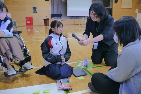 また、実技では、トレーナーチームの大学生が、生徒たちに上肢、体幹、下肢のストレッチやトレーニングを丁寧に優しく教えてくれました。