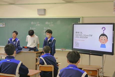 生徒からは,「漁師になって一番良かったと思うことはなんですか?」「どうして勝浦で漁師になろうと思ったのですか?」など,たくさんの質問がありましたが,講師のお二人はこれらの質問に一つ一つ丁寧に答えてくださいました。