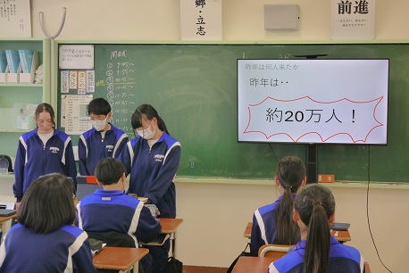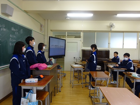 3月17日(火)に、1年生の総合的な学習の時間の発表会が行われました。1年生はこれまでの総合的な学習の時間で、「ふるさと勝浦をもっと深く知ろう」をテーマに、グループ別調べ学習に取り組んできました。調べ学習では、インターネットだけに頼るのではなく、インタビューや書籍の活用、実地体験などを通して、「自分たちで生の情報を集めること」を大切にしてきました。発表会当日は、聞き手に分かりやすく伝わるよう、写真やクイズを取り入れたり、実物を提示したりするプレゼンテーションなど各グループの創意工夫が見られました。発表後の質疑応答では、「まとめ方が分かりやすい」「○○のことについてもう少し詳しく教えて下さい」といった感想や複数の質問が出され発表内容に興味関心をもつ様子が見られました。生徒たちにとって、ふるさと勝浦について理解を深めるとともに、学びを共有する機会となりました。調べ学習にあたり、取材等にご協力いただきました地域の皆様に、心より御礼申し上げます。
