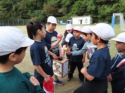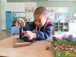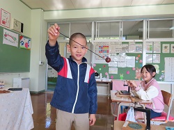 11月5日(水)2校時、1年生活科でどんぐりを使ったおもちゃづくりを行いました。作り方を先生に教えてもらいながら、ドリルやきりを安全に使って「どんぐりごま」や「やじろべえ」を上手に作りました。作ったおもちゃで楽しく遊びました。
