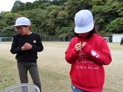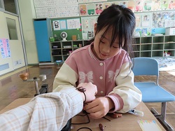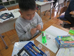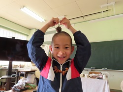 11月14日(金)の2校時、1年生の生活科で「秋と仲良し 木の実で遊ぼう」を行いました。ドングリに穴を開けて紐を通し、想像力を膨らませながら、ネックレスやブレスレット、けん玉などを作りました。