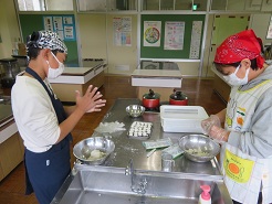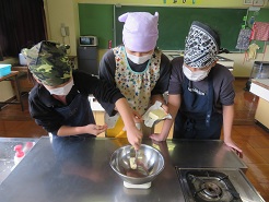 1月20日(火)2校時、6年家庭科の授業で、クッキーの下地作りを行いました。3人で協力して上手に下地を作りました。6年生のこどもたちは、チームワークばっちりです。