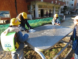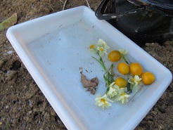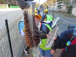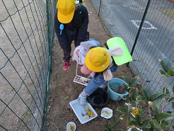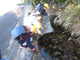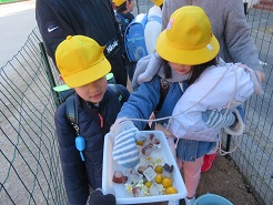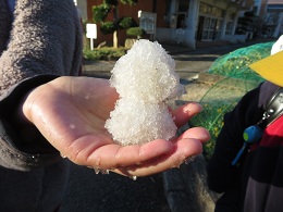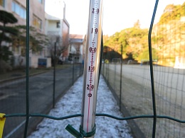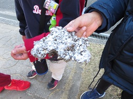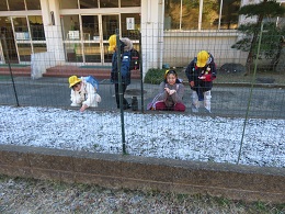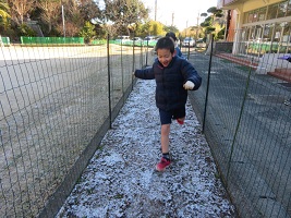 1月22日(木)、前日の夜に雪が降り、花壇などにうっすらと雪が残っていたり池の水が少し凍っていたりしました。外の温度計は1℃、子どもたちは登校すると雪や氷を見つけて大喜びで寒さも忘れて夢中になって遊んでいました。自然が大好きな興津っ子です。