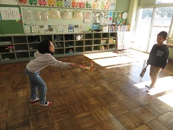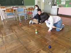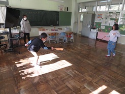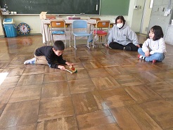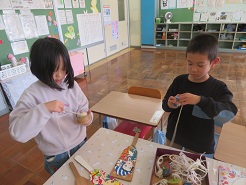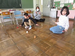 1月14日(水)4校時、1年学級活動で、昔の遊びを体験しました。羽子板では、はねをつく練習をした後に、楽しみながら2人ではねをつきました。こまやだるま落としなど、昔の遊びを体験して笑顔いっぱいの子どもたちでした。