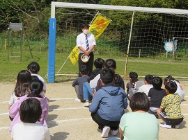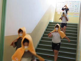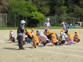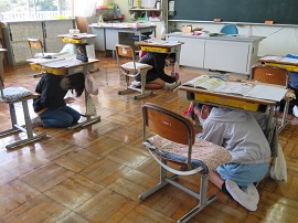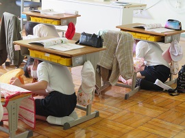 4月13日(水)地震を想定した避難訓練を行いました。子どもたちは教頭先生の放送が入るとすぐに机の下にもぐり,防災頭巾をかぶり,頭を守る体勢をしっかりととることができました。そして,おしゃべりをせず,素早くグラウンドに避難することができました。
