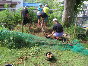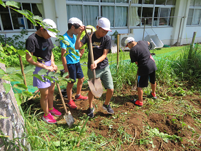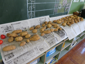 7月16日(金)の1校時に、6年生が理科の学習で育てたジャガイモを収穫しました。5月にジャガイモの葉に日光が当たるとデンプンができることを学習し、2か月後に大きく育ったジャガイモを収穫することができました。