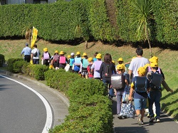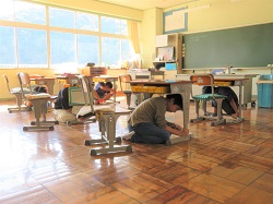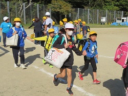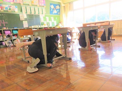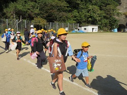 地震の放送が入り、机の下、グラウンドへと避難をした後、1年生と6年生、2年生と5年生、3年生と4年生でペアを作り、ブルーベリーヒルへ避難しました。重い荷物を持ちながらの避難でしたが、子供たちは足取りを止めることなく、一生懸命歩くことが出来ました。