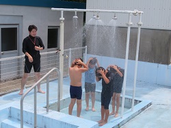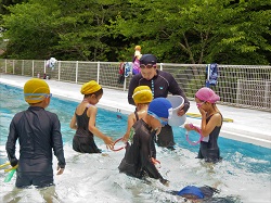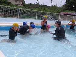 1年生は初めての水泳学習で、プールの深さに驚きながらも、一生懸命水に慣れる練習をしました。2~6年生は、バタ足や蹴伸びの練習を行いました。自由時間は、先生方も混ざって子どもたちと鬼ごっこなどで楽しく遊びました。