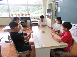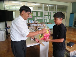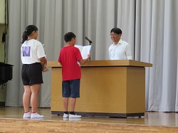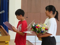 令和5年7月20日(木)4月より、産休代替として、5年生を受け持っていただいた田中先生が、本日で興津小学校を離れることとなりました。5年生は、田中先生とのお別れ会を開き、UNOやボッチャなどでたのしく遊んだ後、手紙やお花をプレゼントしました。終業式では、5年生代表児童がお礼の言葉と花束を贈呈しました。
