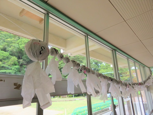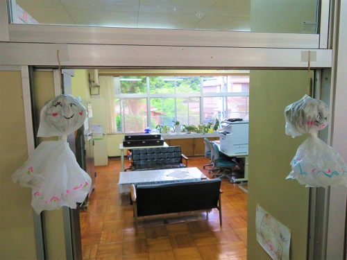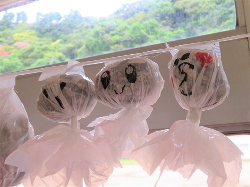 『運動会当日が晴れますように』と願いを込めて、1・2年生が様々な表情のてるてる坊主を作り、昇降口にさげました。ぜひ、来校した際にご覧ください。