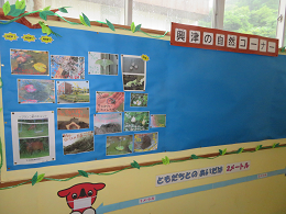 校舎東階段の踊り場に、「興津小の自然コーナー」があります。興津小の豊かな自然を季節ごとに全校で共有するのが目的です。6月28日には、モリアオガエルが姿を見せてくれました。今後、子どもたちや職員が見つけた興津小ならではの自然をどんどん紹介していきます。
