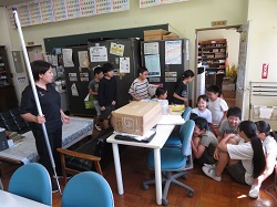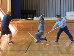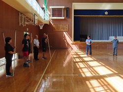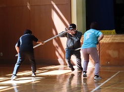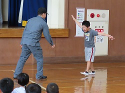 その後の実演では、3年代表児童が登下校中に不審者に話しかけられた場面を想定して行いました。距離を置きながら大きな声で「助けて」と叫びながら逃げることができ、大変立派でした。また、最後には職員を対象としたさすまたを使った実践研修も行っていただきました。さすまたの正しい使い方やさすまたが無い場合の対応法など、細やかなご指導をいただきました。