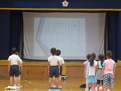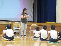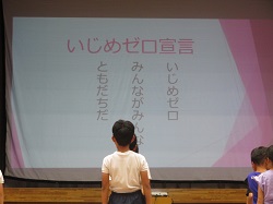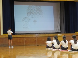 いじめ撲滅集会では、初めに、JRC委員会の代表児童が、いじめに関する絵本の読み聞かせを行いました。その後、教頭先生からボールを人の心に見立てたお話をいただきました。
