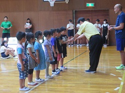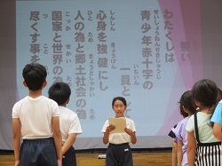 JRC登録式では、初めに全校で青少年赤十字の歌を元気よく歌いました。次に、JRC委員会の児童が、VS活動や募金活動などの校内での活動内容を説明し、最後に、1年生が校長先生からバッジを授与してもらいました。