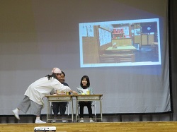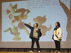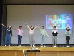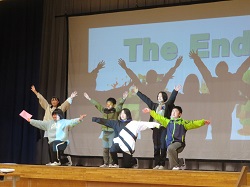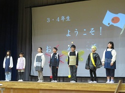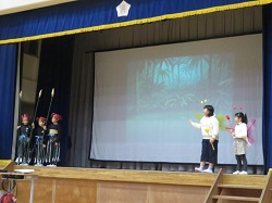 その後、学年発表に移り、3・4年「ようこそ!おもしろ日本語ワールド」、5年「四コマ四字熟語」、6年「Momotaro」の順で、各学年工夫を凝らした発表を行いました。