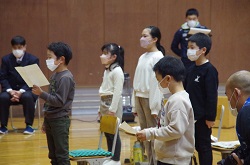 12月9日(金)の5校時に、体育館で音読発表会を実施しました。全校音読「夕日がせなかをおしてくる」では、5年生の6名が前に並び、リズムに合わせながら全校児童を引っ張ってくれました。