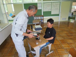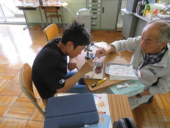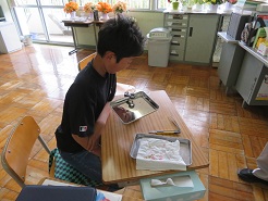 5月8日(木)6校時、5年理科で発芽と養分の学習を行いました。種子の外側の皮をむき、子葉の部分にヨウ素液をつけて変化を観察しました。子葉の部分が濃い青紫色に変化し、養分がつまっていることがわかりました。