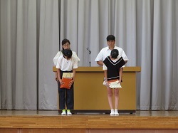 令和5年7月20日(木)1学期の終業式・賞状伝達を行いました。生徒指導担当より、夏休みの過ごし方をクイズ形式で行い、子供たちは楽しく学ぶことが出来ました。その後、教頭より、ストレスや悩みの対処法についてパワーポイントを使ってお話がありました。