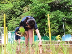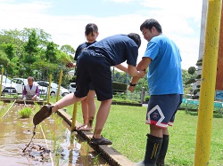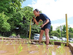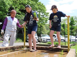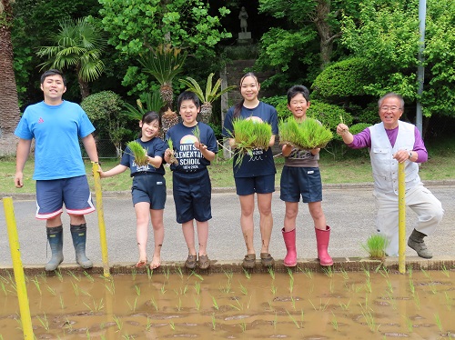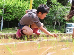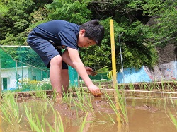 5月8日(木)の3校時に用務員の鈴木さんから、苗の植え方を説明してもらい、田植えを行いました。途中、田んぼの土に足を取られ転びそうになる場面もありましたが、子どもたちは真剣な表情で、一本一本間隔を考えながら苗を植えました。秋の収穫が今からとても楽しみですね。