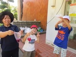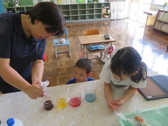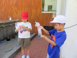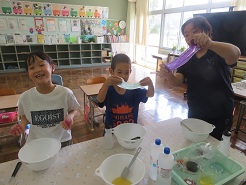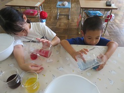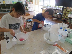 9月17日(水)2校時、1年生活科で学校周辺に咲いている花を使った色水づくりと色水を使ったスライム作りに挑戦しました。子どもたちは、グラウンド周辺を探検しながら、色水に使えそうな、オシロイバナ、ツユクサ、アサガオ、マリーゴールドの花を見つけました。見つけた花を使った色水はそれぞれがとてもきれいで、その色水を使ったスライムを楽しみながら作り、とても楽しい時間を過ごしました。