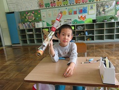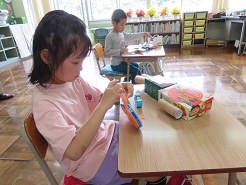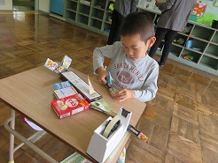 5月14日(水)3校時、1年図工で「いろいろなかたち」の学習を行いました。いろいろな形の箱を組み合わせて、自分のイメージした作品を作っていきます。箱を組み合わせて、カジキや女の子を上手に表現しました。作品ができあがって子どもたちはうれしそうにしていました。