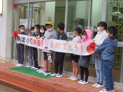 学校で応援をしていた子どもたちも,勝利の放送が入ると「わー!!やったー!」と,歓声をあげ,選手たちを「興津小 祝 準優勝おめでとう!」の横断幕で出迎えました。
