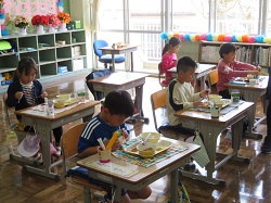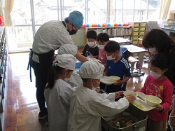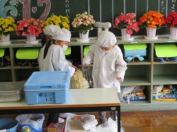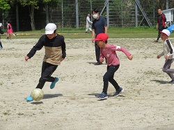 令和5年4月11日(火)1年生の学校生活2日目がスタートしました。1・2年生のお楽しみ会では、体育館で、線の上で器用に逃げ回る「線鬼」を行いました。休み時間は、お兄さん・お姉さんと一緒にサッカーや鬼ごっこを楽しみました。給食では、白衣の着方・配膳の仕方を学びながら、みんなで協力して行うことが出来ました。